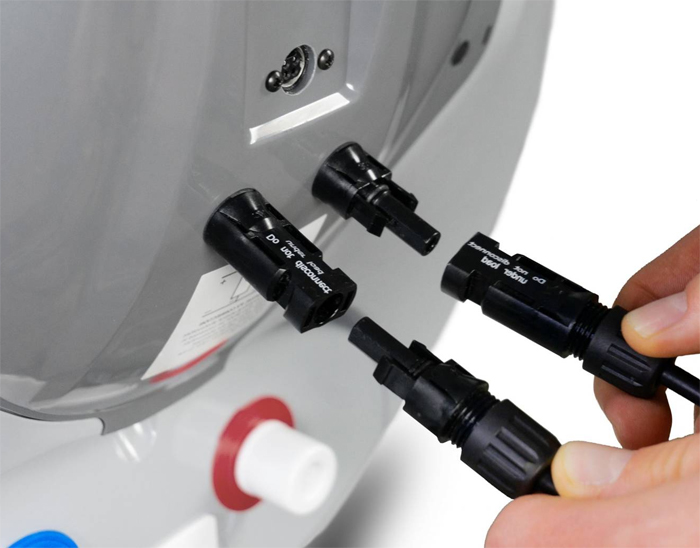 Montaža fotonaponskih modula vrlo je jednostavna zahvaljujući priključcima „plug & play“. Moduli se izravno spajaju na bojler preko MC4 utičnih kontakata. Za premošćivanje većih udaljenosti između fotonaponskih modula i bojlera može se opcionalno koristiti produžni kabel.